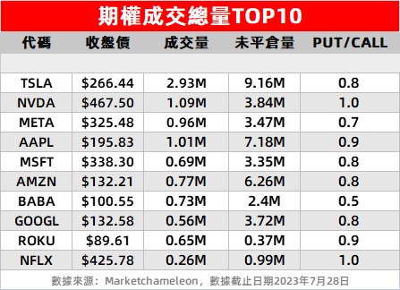 2、Meta $META 周四公布Q2业绩全线超预期,Facebook日活与月活创新高。股价周内大升10.61%,上周五成交量96万张,未平仓量347万张。其中,看涨期权57.6万张,累计金额3.93亿美元,约为看跌期权累计成交额的3倍。