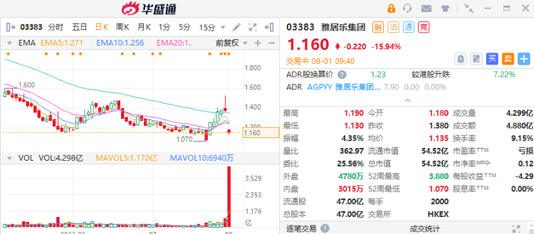 8月1日讯,雅居乐集团盘初低开低走,股价现跌近16%,公司公告拟拟先旧后新配售3.46亿股现有股份,净筹约3.87亿港元。