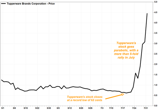 自特百惠(TUP.N)在7月18日收于历史低点0.62美元后,就开启了它的历史性上涨之路,迄今为止已飙涨逾7倍。