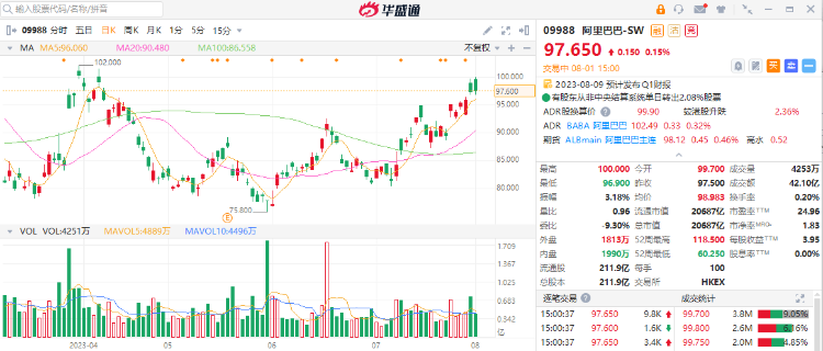 阿里( $09988.HK )由上周四起连升,今早继续上升。早段曾高见100港元,创逾3个月新高后升幅收窄。现报97.55港元,此前连续3日上升。有报导指蚂蚁集团正计划重组,但有报导引述消息指,蚂蚁集团短期内重新上市的可能性不大。