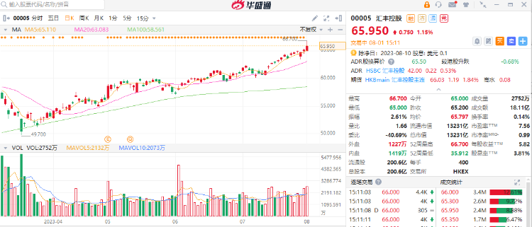 汇丰控股( $00005.HK )今日中午公布截至今年六月底止的中期业绩,期内列账基准除税前利润216.57亿美元,按年升146.7%,高于市场预期。滙控并宣布派发二次股息每股10美仙,及计划进一步回购最多达20亿美元股份。汇控昨日反弹,今早低开后反弹,午后抽升高见66.7港元,创5年新高。现报65.95港元,升约1.2%。