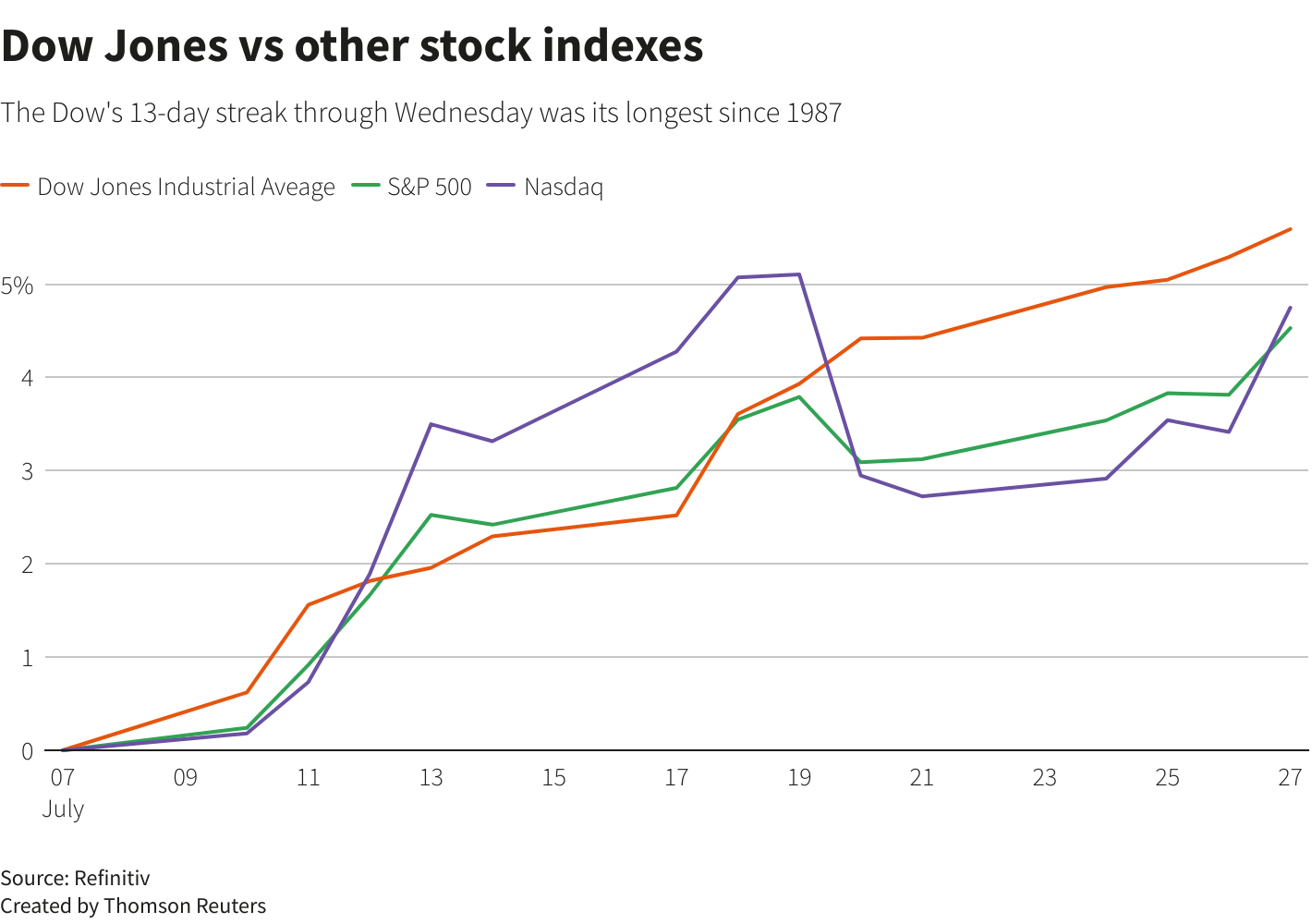 另外,美国大型科技股指数的市值今年已接近翻倍,在人工智能和广告业反弹的持续刺激下,它们的领先业绩继续超出预期。甚至连华尔街蓝筹股指数——道琼斯指数也一路高涨,创下了至少自1987年以来最长的单日涨幅。