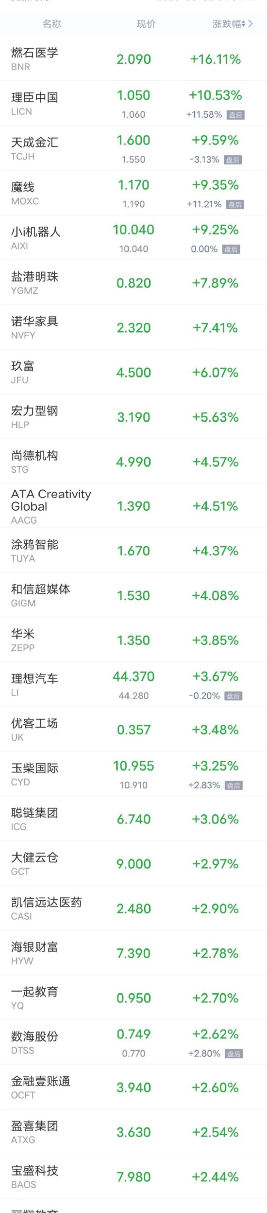 燃石医学涨超16%,理臣中国涨超10%,天成金汇,魔线,小i机器人涨超9%,聪链集团涨超8%,盐港明珠,诺华家具涨超7%,玖富涨超6%,宏力型钢涨超5%,尚德机构,涂鸦智能,和信超媒体涨超4%,华米,理想汽车,优客工场,玉柴国际涨超3%,大健云仓,凯信远达医药,海银财富,一起教育,数海股份,金融壹帐通,盈喜集团,宝盛科技等涨超2%。