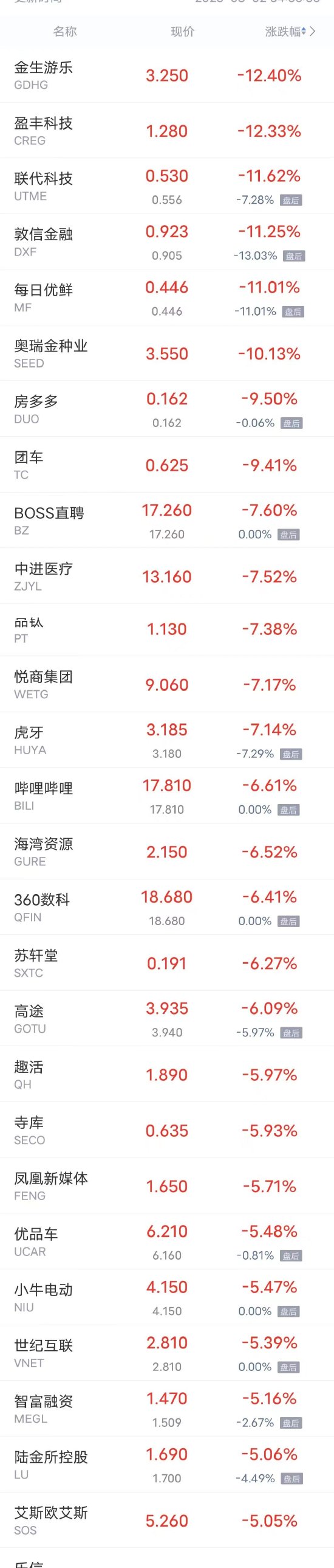 金生游乐,盈丰科技跌超12%,联代科技,敦信金融,每日优鲜跌超11%,奥瑞金种业跌超10%,房多多,团车跌超9%,BOSS直聘,中进医疗,品钛,悦商集团,虎牙跌超7%,哔哩哔哩,海湾资源,360数科,苏轩堂,高途跌超6%,趣活,寺库,凤凰新媒体,优品车,小牛电动,世纪互联,智富融资,陆金所控股,艾斯欧艾斯,乐信等跌超5%。