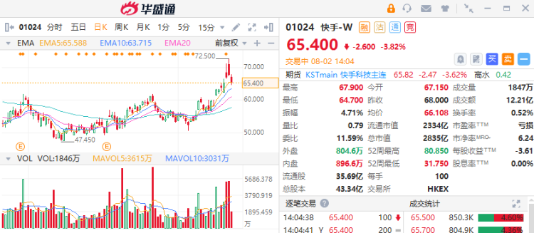 快手(1024)发盈喜,料上半年扭亏为盈,录得净利润不少于5.6亿元人民币。在资金流入好仓部署的个股中,昨日快手位列亚席。今早快手回吐,曾触65.45港元,昨日港股通录得北水南向净流出快手达4.53亿港元。