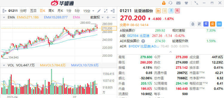 比亚迪(1211)昨日曾高见280.6港元,创近一年新高,惟收市跌约0.3%。今早低开约0.6%后早段曾反弹,最高见279.6港元,及后再度下跌。若观察比亚迪本年初至今表现,则见其股价累计升超过30%,显著跑赢大市。比亚迪公布,七月新能源汽车产量及销量分别达272,414及262,161辆,按年增加66.8%及61.3%。