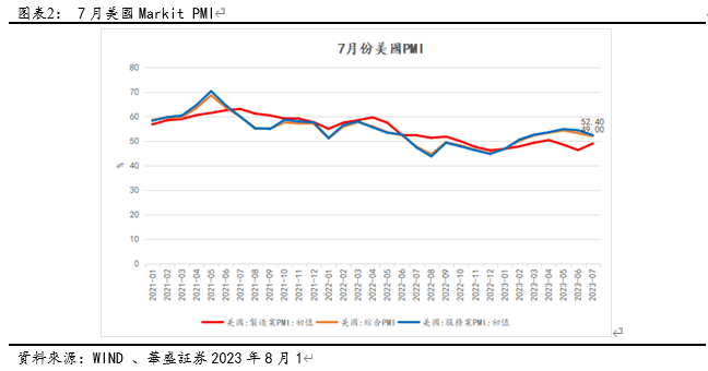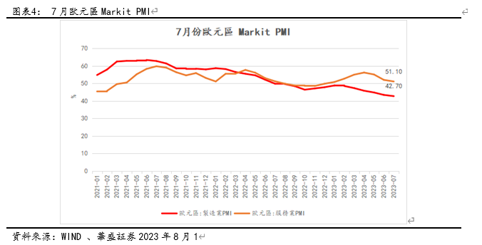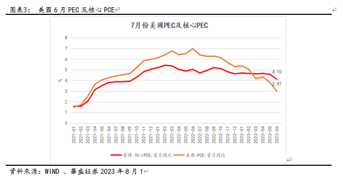 美国6月核心PCE价格同比回落至4.1%,低于预期的4.2%,环比从0.3%回落至0.2%,符合市场预期,PCE同比增速回落至3.0%,环比回升至0.2%,均符合市场预期。我们认为核心PCE通胀同比低于显示通胀压力可能出现缓解,若后续通胀持续超回落将推升真实利率,这将更坚定投资者对加息终点将至的信心。