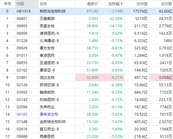 虽然恒瑞医药对传闻予以了澄清,但市场对医药股的空头情绪逐渐蔓延开来,港股医药板块也开始受到冲击。