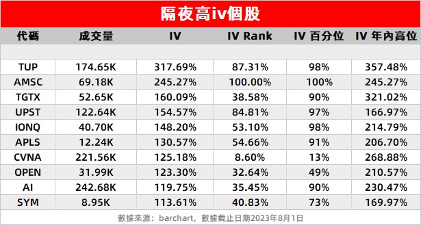 1、特百惠 $TUP 隔夜再度飙升26%,数据显示,该股近八个交易日股价累涨近710%。期权方面,隔夜成交近17.5万张,隐含波动率317.69%,靠近年内高位。