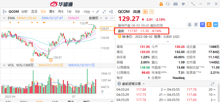 财报公布后,高通股价在盘前交易中下跌超8%。