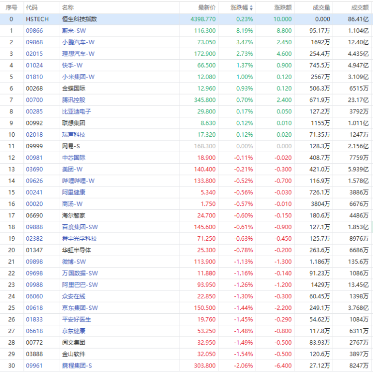 造车新势力强势反弹,蔚来-SW劲升超8%,小鹏汽车-W涨超3%,理想汽车-W涨超2%。科网股涨跌互现,快手-W涨超1%,腾讯控股现涨0.70%;携程集团-S现跌超2%,阿里巴巴-SW跌超1%。