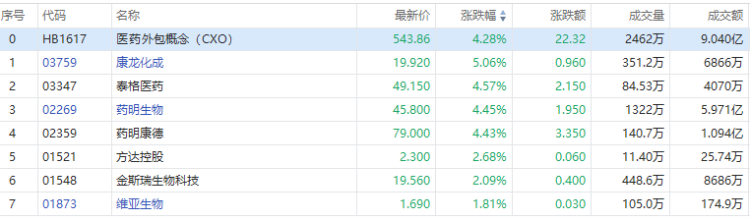 8月3日讯,今日医药外包概念股集体反弹,康龙化成涨超5%,药明生物、泰格医药、药明康德均涨超4%。