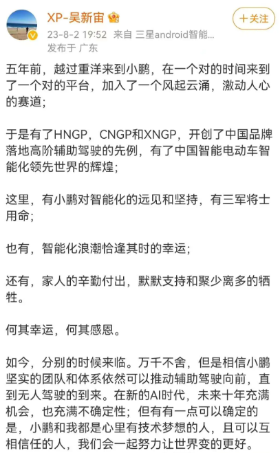 同日,何小鹏发布微博表示:“因为家庭和多方面的原因,新宙在去年下半年表示要回到美国,里面原因很多,但是我非常尊重和认可他的思考。”