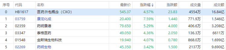 医药外包概念股强势上涨,康龙化成涨近8%。消息面上,纪检监察机关配合开展全国医药领域腐败问题集中整治工作动员部署视频会议今日在北京召开,医药反腐正在进行时,但交银国际指出,短期内本轮反腐将打击、清退部分运营不合规的企业,但对合规较严格的龙头药企和械企来说影响有限;长期来看,这将进一步扭转医药行业重销售、轻学术的现状,促使真正具有创新性的产品脱颖而出,利好创新药和创新器械行业的健康发展。