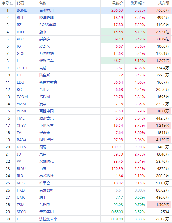 百济神州 $BGNE 涨逾7%,哔哩哔哩涨逾7%,陆金所 $LU 、万国数据 $GDS 、拼多多 $PDD涨逾5%;高途 $GOTU 、新东方教育 $EDU 涨逾4%;京东 $JD 、百度 $BIDU 、阿里 $BABA涨逾2%。
