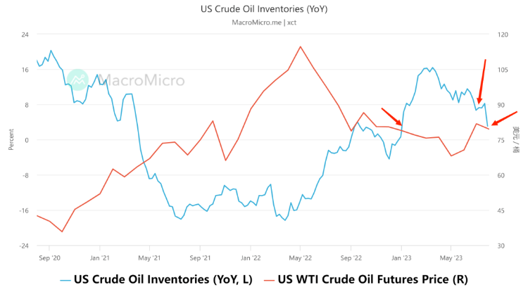 与此同时,自从6月底以来,所有人都不再谈论经济衰退,而WTI原油价格随着经济预期的改善以及OPEC的大幅减产,有了大幅反弹,由最低点的69元反弹至最高点的82元,增长了近20%。