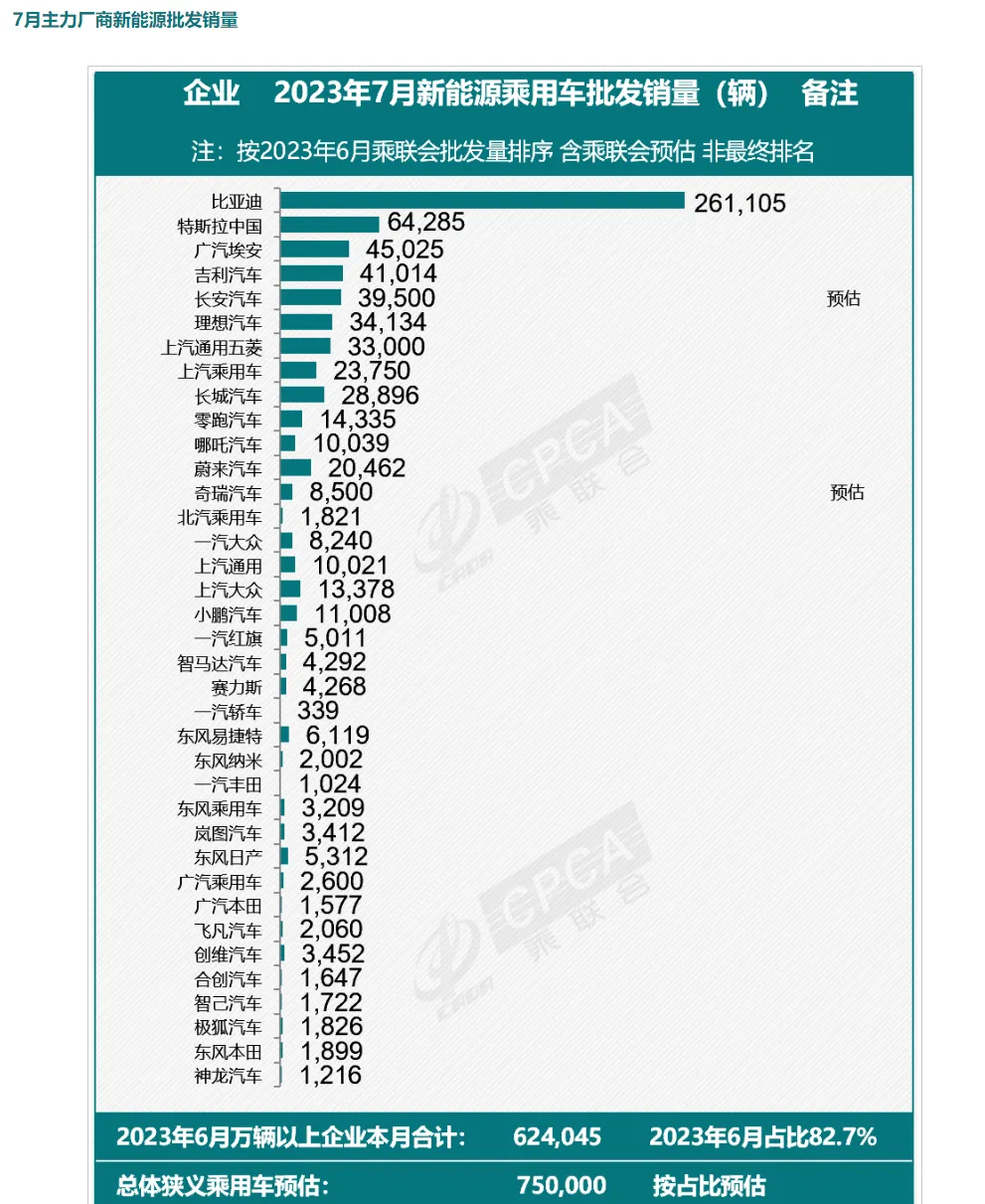 乘联会发布7月主力厂商新能源批发销量:比亚迪7月份新能源乘用车批发销量预估为261,105辆,位居榜首;特斯拉预估为64,285辆,位居第二。