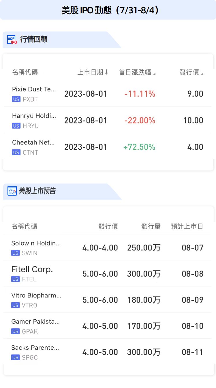 截至8月4日,接下来预计有5只美股新股上市,包括Solowin Holdings $SWIN 、Fitell Corp $FTEL 、VTRO Vitro Biopharma $VTRO 、Gamer Pakistan $GPAK 、Sacks Parente Golf $SPGC