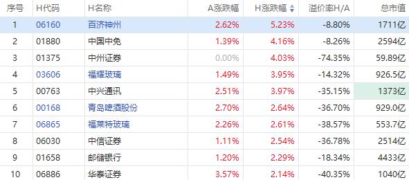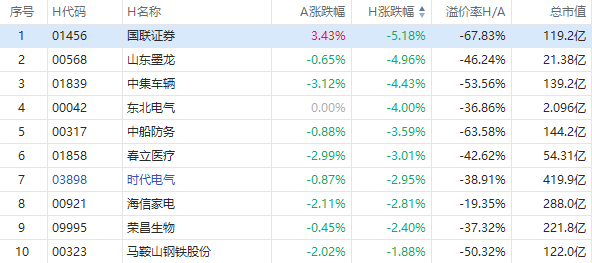 国联证券A股涨3.43%,H股现跌超5%;中集车辆A股跌3.12%,H股现跌4.43%;山东墨龙股跌0.65%,H股现跌4.96%。