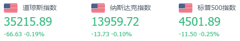 截止周四收盘,道指跌0.19%,报35215.89点;纳指跌0.10%,报13959.72点;标普500指数跌0.25%,报4501.89点。市场等待周五将公布的非农就业数据。