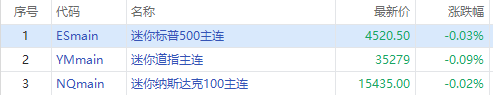 周五美股盘前, 美国非农就业数据低于预期,三大股指期货盘前转跌,截至发稿,标普500指数期货 $ESmain 跌0.03%,道指期货 $YMmain 跌0.09%,纳指期货 $NQmain 跌0.02%。