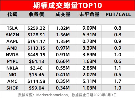 2、亚马逊 $AMZN 隔夜成交量跃升至第二位,看涨期权成交量占比达60.5%,不过,看跌期权持有量在过去 5 天内上涨了4.0%。昨日美股盘后,亚马逊发布了“井喷”的第二季度业绩报告,营收、每股收益及Q3业绩指引均超出了华尔街预期。今日美股盘前,亚马逊一度拉升超9%。