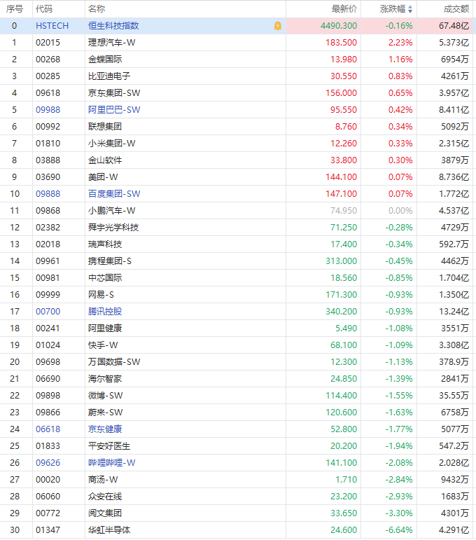 造车新势力涨跌不一,理想汽车涨逾2%,蔚来跌近2%;科网股多数走低,京东集团-SW、小米集团-W、阿里巴巴-SW、比亚迪电子小幅上涨;中芯国际、腾讯控股跌近1%,快手-W跌超1%,哔哩哔哩-SW跌超2%,华虹半导体跌超6%。