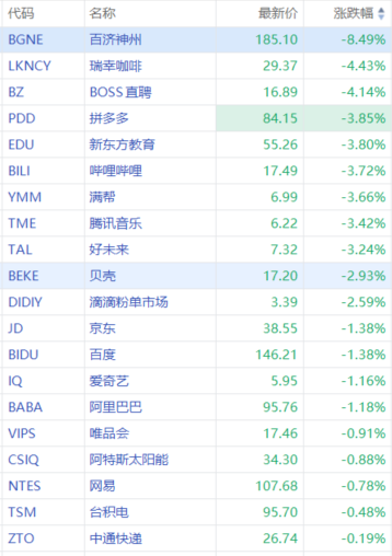华盛资讯8月7日消息,热门中概股多数走低,百济神州跌超8%,瑞幸咖啡、Boss直聘跌超4%,拼多多、哔哩哔哩、满帮跌超3%,好未来、贝壳、滴滴跌超2%,百度、阿里巴巴跌超1%。