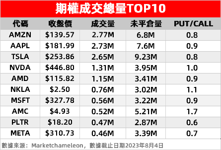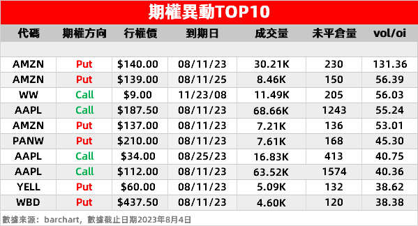 1、亚马逊:公司股价已达到近一年来最高水平,期权大单押注该股短线冲高回落;其行权价139和140美元、8月11日到期的末日PUT单出现异动,两个合约的隔夜成交量超3.8万张。