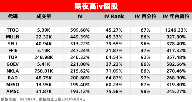1、T2 Biosystems:为一家体外磁共振诊断公司,上周五股价暴跌28%;T2将于今日盘后公布Q2业绩,股价盘前已大举反弹。隔夜该股期权成交量增至5400张,隐含波动率达到599.68%。