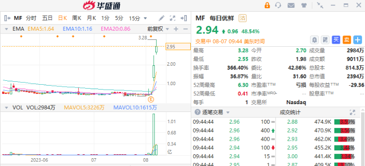 截至发稿,每日优鲜(MF)暴涨48.54%,报2.94美元,该股前一交易日暴涨284%。消息面上,据报道,每日优鲜称已引入投资。具体来看,公司分别与两家投资机构签订了两份股份购买协议,两者将认购总计54亿股每日优鲜B类普通股,耗资2700万美元(约合人民币约1.94亿元)。