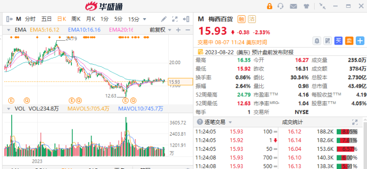 该公司将于 8 月 22 日发布 2023 年第二季度财务业绩,但我们可以回顾第一季度,看看梅西百货现在的处境。营收为 50 亿美元,略低于去年同期的 53 亿美元,比分析师预期低 8,400 万美元。然而,梅西百货的盈利表现更为强劲,GAAP 每股收益为 56 美分,比预期高出 10 美分。展望未来,梅西百货修改了对 2023 财年销售额的预期,目前预计范围为 $22.8B 至 $23.2B。此次调整与之前的 $23.7B 至 $24.2B 预测形成鲜明对比,并且低于 $24.01B 的共识估计。