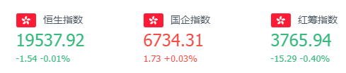 截至周一收盘,恒生指数跌0.01%或1.54点,报19537.92点,全日成交额789.79亿港元;恒生国企指数涨0.03%,报6734.31点;恒生科技指数涨0.05%,报4499.43点。