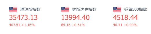 截至收盘,纳斯达克综合指数涨0.61%,报13,994.40点;标普500指数涨0.90%,报4,518.44点,双双结束四连跌;道琼斯指数涨1.16%,报35,473.13点。大型科技股多数收涨。苹果收跌 1.73%,连跌五个交易日。热门股票方面,美国超导美股盘中一度跌超14%。每日优鲜美股盘中涨超40%。该股上个交易日收涨超280%,公司近日获2700万美元投资。