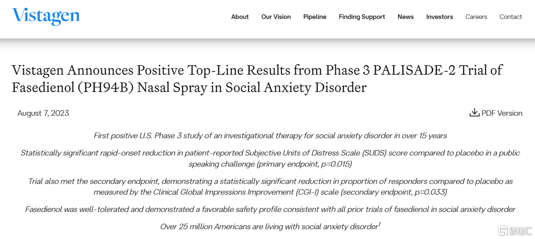 消息面上,8月7日,Vistagen公布了PH94B(fasedienol)治疗社交恐惧症的III期PALISADE-2研究的积极结果。