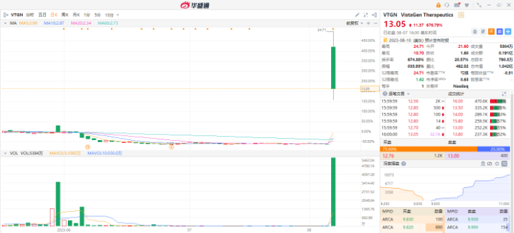 在国内医药反腐,医药相关板块个股大跌之际,美股医药公司Vistagen一夜翻了10倍,盘初一度暴涨1370%,盘中多次触发熔断,目前收涨676.79%。