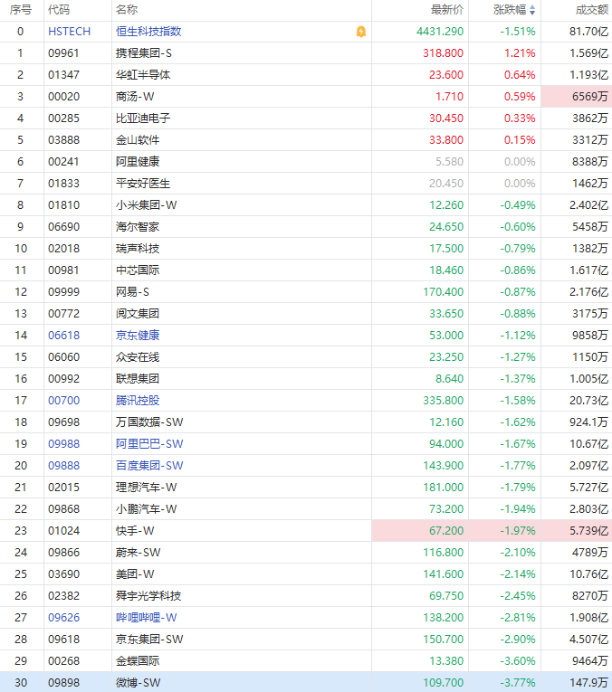 科网股集体走低,哔哩哔哩-W、京东集团-SW跌近3%,舜宇光学科技、美团-W跌超2%,万国数据-SW、阿里巴巴-SW、百度集团-SW、腾讯控股、京东健康跌超1%;阅文集团跌近1%。携程集团-S涨逾1%,华虹半导体、商汤-W、比亚迪电子等跟涨。