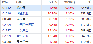 港股方面,黄金股同样表现活跃。截至发稿,招金矿业涨3.65%,中国黄金国际涨超2%,紫金矿业涨超1%。