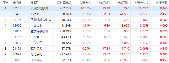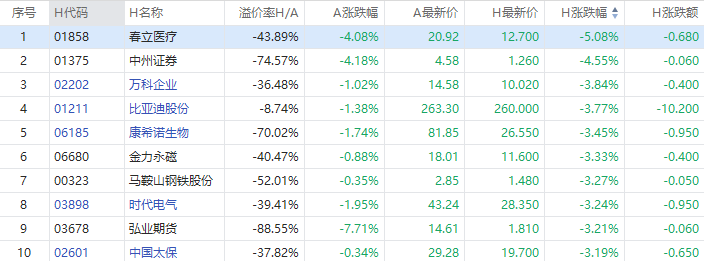 春立医疗A股跌4.08%,H股现跌超5%;万科企业A股跌1.02%,H股现跌3.84%;比亚迪股份A股跌1.38%,H股现跌3.77%。