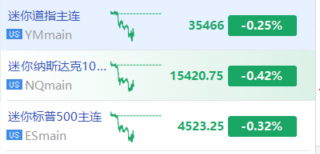 华盛资讯8月8日消息,三大股指期货走跌,截至发稿,纳指期货 $NQmain 现跌0.42%,标普500指数期货 $ESmain 跌0.32%,道指期货 $YMmain 跌0.25%。