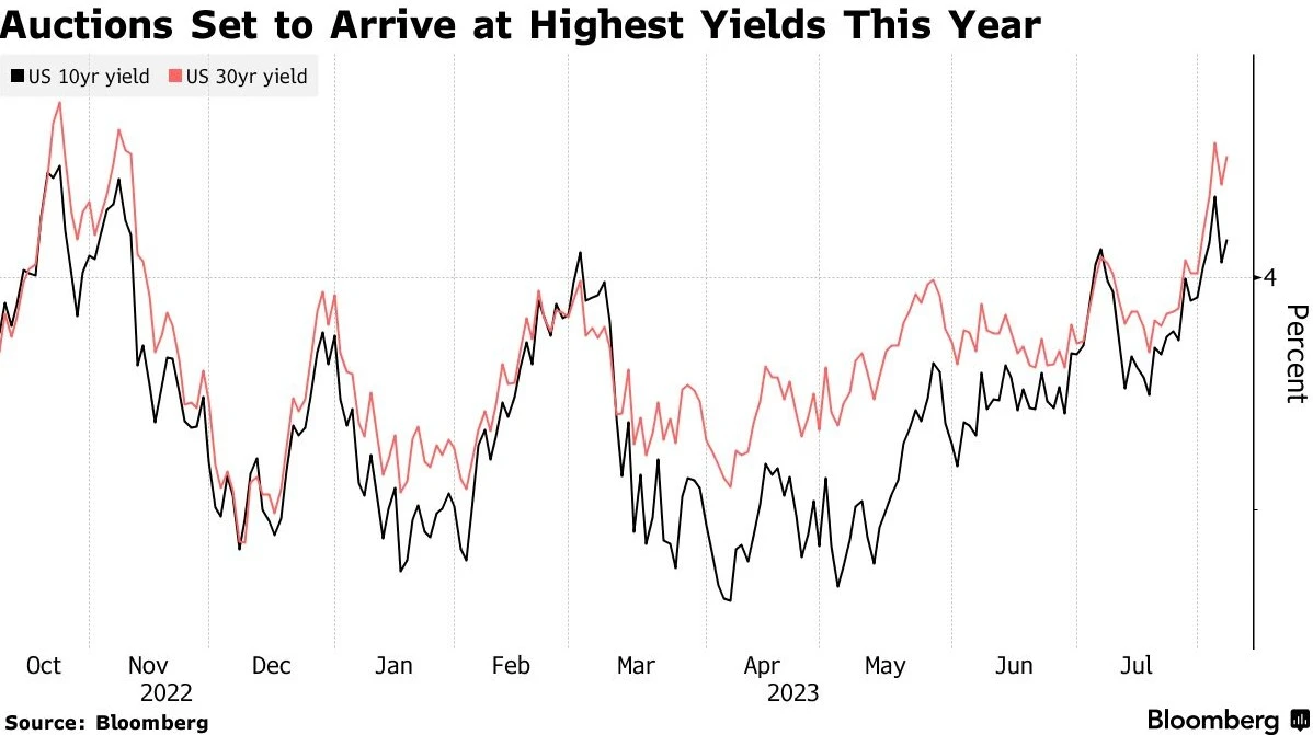 本周结束前,债券市场必须吸收总计1,030亿美元的3年期、10年期和30年期美国国债拍卖,较5月增加70亿美元,同时本周四将公布关键的通胀数据。据悉,美国10年期和30年期国债收益率(殖利率)较几周前高出约20个基点或更多,有望在10月达到多年高点。在每次拍卖之前,市场预计将推高收益率,以吸引更多买家,并使一级交易商在拍卖后可抛售的债券减少。在过去的五次拍卖中,美国10年期国债的销售"放缓",需求不温不火导致收益率高于预期。