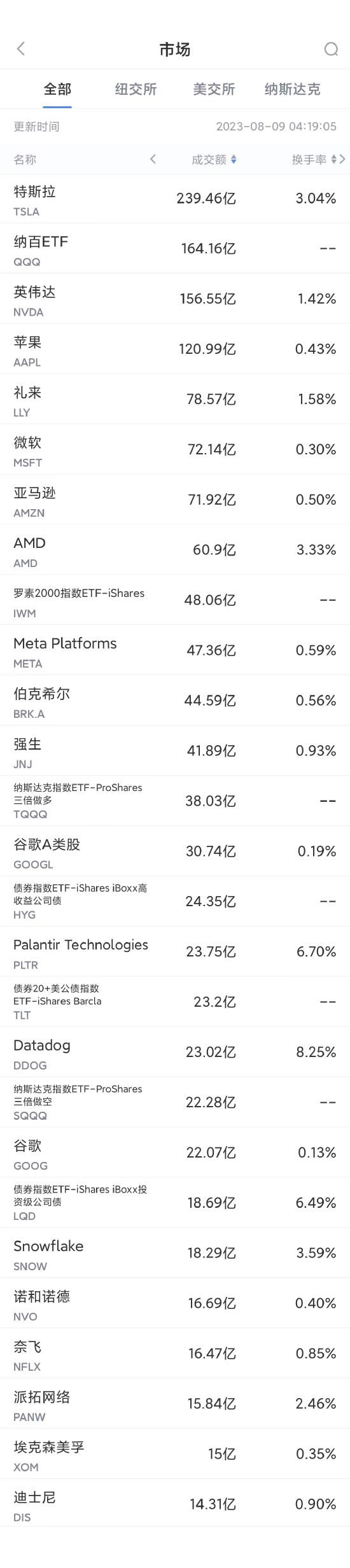 以下为美股当日交易最活跃的20只股票(按成交额):