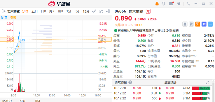 恒大物业(06666)复牌后四连跌,早盘一度涨超10%,截至发稿,恒大物业涨7.23%,报0.89港元,成交额2180万港元,最新总市值96.22亿港元。