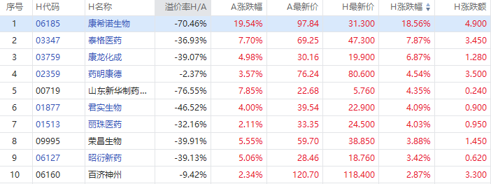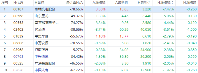 京城机电股份A股涨3.36%,H股现跌超7%;山东墨龙A股跌1.33%,H股现跌5.06%;中兴通讯A股跌1.39%,H股现跌2.06%。