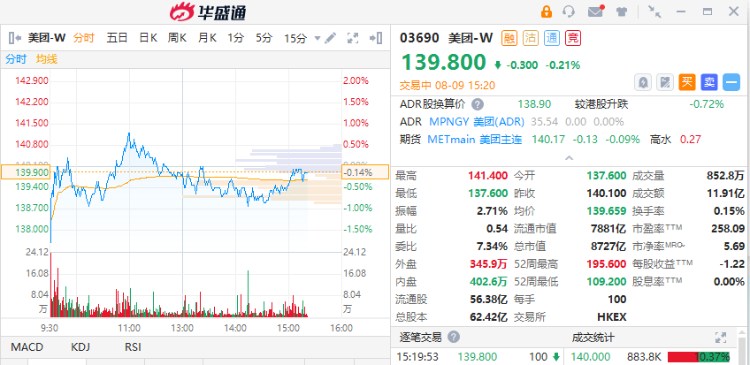 美团 $83690.HK 昨日跌约3.2%,守稳在140港元水平收市,今早则低开见137.6港元的近两周低位后跌幅收窄,并曾出现反弹,最高见141.4港元。有券商料美团今年次季总收入达667.7亿元人民币,按年增长31.1%,并料今年第三季的到店、酒店和旅游业务,于暑假期间将受惠于旅游及线下服务需求持续回升。
