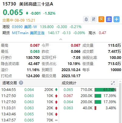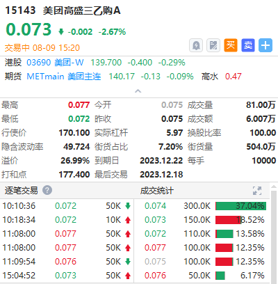 美团购15143 $15143.HK ,行使价170.1港元,2023年12月22日到期,实际杠杆6.1倍,轻微价外、低面值、低街货