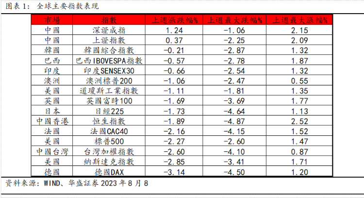 港股市场方面,受惠誉将美国的长期评级从“AAA”下调至“AA+”,美国财政恶化和债务负担是主因,令市场略感意外,短期催生了短期的避险情绪。国内经济数据起色不大,上周美债收益率走高,人民币走弱,港股资金面有所恶化,叠加宏观政策组合拳的消息淡化。自上周一开始市场成交量放大至1825亿但后续乏力,缩减至周四的1011亿,市场气氛转向谨慎可能延续至今周,我们对第三季的表现展望维持正面看法,内地复苏进展持续,恒指考验19300点的支持力度。