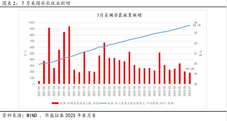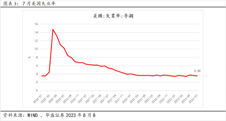 非农显示7月制造业招聘需求放缓,同时ADP数据显示制造业裁员 3.6万人,服务部门新增就业对非农总量形成支撑。从商品生产部门来看,建筑业新增就业1.9万人(前值2.6万人)、制造业裁员0.2万人(前值新增0.6万人)。从服务提供部门来看,休闲酒店娱乐新增就业1.7万人(前值1.9万人)、教育和保健服务新增就业10万人(前值7.1万人)、其他服务业新增就业2万人(前值1.1万人)、批发业和零售业也从6月的裁员回到7月增加就业,服务业就业强于制造业持续,部分细分行业供应紧张。私人部门非农员工平均时薪 33.74美元,同比+4.36%,环比+0.42%,较上月环比增幅小幅收窄,但就业需求旺盛造成薪资粘性依旧较大。