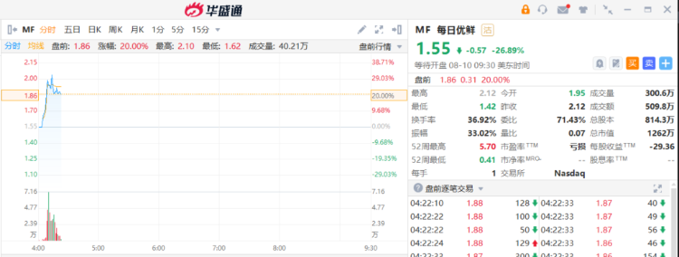 每日优鲜盘前涨20%,隔夜大跌26%。此前公司宣布与英属维尔京群岛公司Freshking Limited签订股权转让协议,根据股权转让协议,每日优鲜同意将其持有的Missfresh HK Limited、San Shen Limited和Mrfresh Limited的全部股份转让给了Freshking Limited或Freshking Limited指定的任何其他人士,以换取总代价1美元现金,但须满足某些交割条件,包括收到董事会审计委员会聘请的财务顾问出具的书面意见。