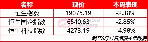 恒生指数本周跌2.38%,报19075.19点;国企指数本周跌2.85%,报6540.63点;恒生科技指数本周跌4.98%,报4273.19点;